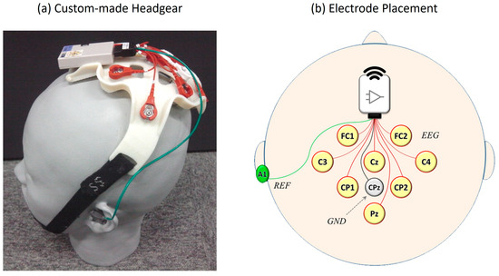 EEG signals were recorded from eight scalp locations based on the international 10–10 system [66]: FC1, FC2, C3, Cz, C4, CP1, CP2, and Pz (Figure 2b). Stainless steel electrodes were used with gel-soaked cotton balls between the electrodes and scalp to ensure stable signal acquisition. These eight locations were labeled as Channels 1 through 8 for subsequent analysis. The electrode configuration was chosen to cover the central and parietal scalp regions, where ERPs, particularly the P300 component, are typically the most prominent [22,67].