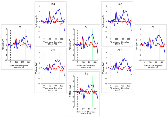 ERPs from a representative participant during the Target-selection Task. Each panel displays ERP waveforms recorded from one of the eight electrode positions arranged to reflect their approximate relative positions on the scalp, with top to bottom and left to right corresponding to the anterior–posterior and left-right orientations of the head, respectively. The blue line indicates the average ERP response to the target stimuli, and the red line represents the response to non-target stimuli. The dashed vertical line indicates the timing of stimulus onset, and the green vertical line denotes the peak latency identified from the grand average across all channels. The x-axis denotes the time (in milliseconds) from stimulus onset, and the y-axis represents the voltage (in μV). Across all electrode sites, a stronger positive deflection was observed in response to targets, typically peaking around 500 ms after the stimulus onset.