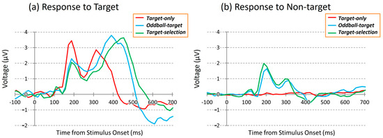 - Hasegawa, R.P.; Nakamura, Y. Properties of the event-related potentials during the target selection task: Toward the development of the cognitive assessment system. Trans. Japan Soc. Kansei Eng. 2020, 19, 89–96. [Google Scholar] [CrossRef]