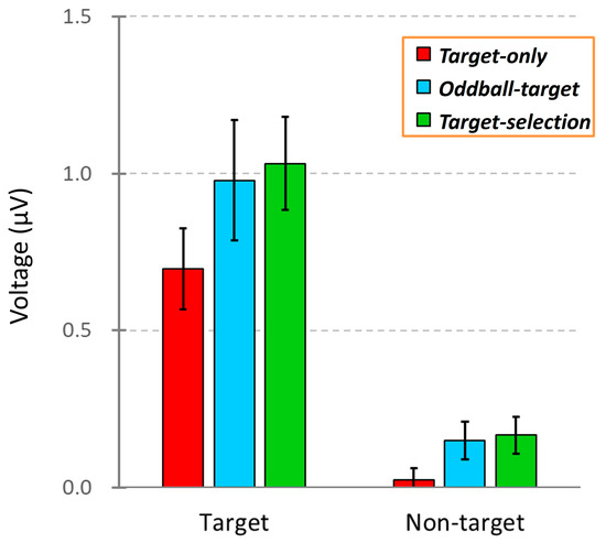 Comparison of ERP amplitudes across three task conditions: Target-only, Oddball-target, and Target-selection. Each bar represents the mean ERP voltage (±SEM) measured between 100 and 700 ms after stimulus onset in response to either the target or non-target stimuli. The data were averaged across the 40 participants.