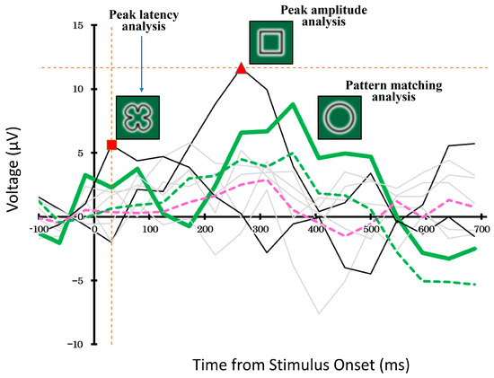 In the pattern-matching method, we compared the ERP waveforms evoked by each of the eight candidate stimuli and selected the waveform that best matched the typical target-related response pattern. The thick green line represents ERP response to the selected stimulus. In contrast, the black solid lines show the waveforms of the stimuli selected using the peak-amplitude and peak-latency methods. The remaining five non-selected stimuli are shown in gray.