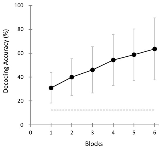 To assess the performance of the pattern-matching method across different stages of the task, we analyzed the decoding accuracy block by block for all participants. Specifically, we computed the decoding accuracy not only for the final (sixth) block, but also for each of the preceding blocks (blocks 1 to 5). This allowed us to assess how quickly and reliably the system could distinguish the targets based on a limited number of repetitions.
