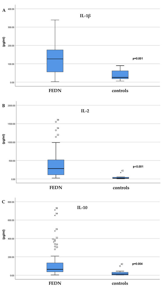 Within our study, statistically significant differences were observed between the patients with FEDN psychosis and the healthy controls for IL-1β, IL-2, and IL-10, whereas the IL-6 levels did not differ significantly (p = 0.698). (Table 2). The analysis of interleukin concentrations showed significant differences between the patients with a drug-naive first-episode psychosis and the healthy controls, suggesting the presence of pronounced immunological changes in the patients. The findings for IL-1β stood out in particular, with significantly higher levels observed in the patient group (130.14 ± 93.22 pg/mL) compared to the healthy controls (37.06 ± 27.61 pg/mL; p = 0.001). In Figure 1A, which shows the distribution of the IL-1β values, it is visible that the patients almost consistently have elevated concentrations compared to the healthy subjects, further confirming the statistical significance of the findings. Similarly, IL-2 was also significantly elevated in the patients (395.7 ± 380.29 pg/mL) compared to the controls (42.15 ± 55.59 pg/mL; p < 0.001). Figure 1B, which displays the IL-2 values, further illustrates this difference, with a clear separation of patient concentrations from those recorded in the healthy population. In addition to the pro-inflammatory cytokines, IL-10, which has an anti-inflammatory effect, was also significantly higher in the patient group (140.65 ± 176.84 pg/mL) than in the control group (24.20 ± 33.43 pg/mL; p = 0.004). Figure 1C, which displays the IL-10 values, indicates a wide range of concentrations in the patient group, reflecting the heterogeneity of the immune response during a psychotic episode, while also confirming a statistically significant difference compared to the healthy control group. In contrast to the previously mentioned cytokines, IL-6 did not show a statistically significant difference in concentrations between the groups (9.13 ± 12.90 pg/mL in patients vs. 5.01 ± 4.28 pg/mL in the controls; p = 0.698). Although the mean values were higher in the patient group, the variability and overlap with values from the control group reduced the statistical strength of this finding.