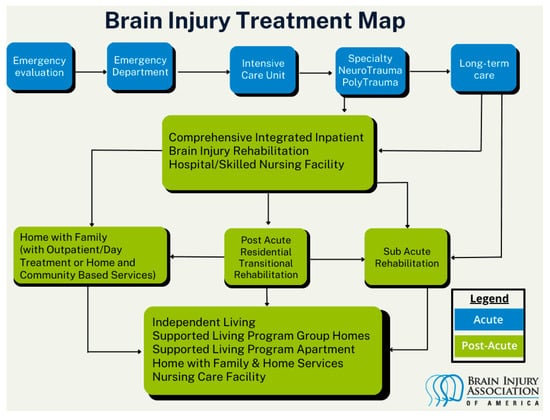 - Brain Injury Association of America. Brain Injury Treatment Map (Image). 2024. Available online: https://biausa.org/brain-injury/about-brain-injury/treatment (accessed on 3 March 2025).