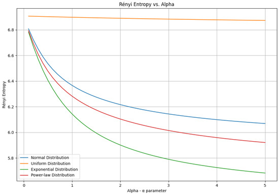 Simulation of the value of Rényi Entropy depending on the value of the parameter . We observe that the value of the entropy represents a logarithmically convex function, i.e., it converges and does not increase depending on the parameter . Additionally, from the figure, we see that the value of the entropy depends more on the probability distribution function of the sample than on the choice of .