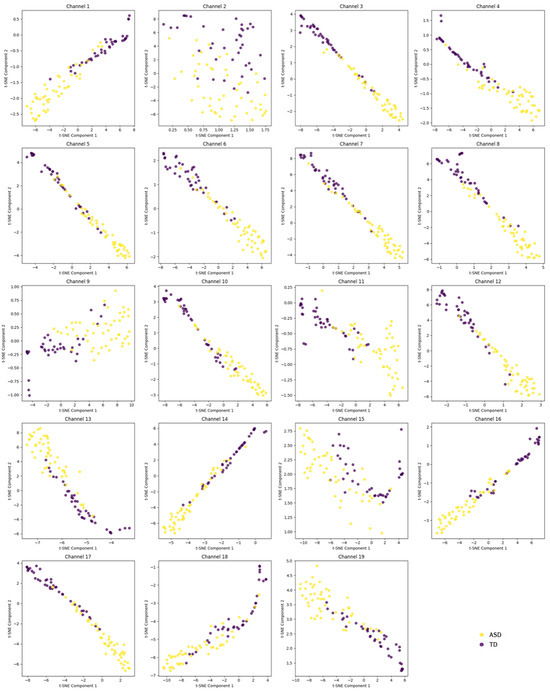 Using this technique, it is shown that regardless of the channel, the features are powerful enough to distinguish between the control and ASD subjects. An interesting finding is that the features from the 2nd, 9th, 11th, and 15th channels, corresponding to the electrodes Fp2, C3, C5, and Pz, introduce some prominent nonlinear patterns, further suggesting that the features from these channels could be used with nonlinear machine learning techniques, depending on the learning scenario being addressed.
