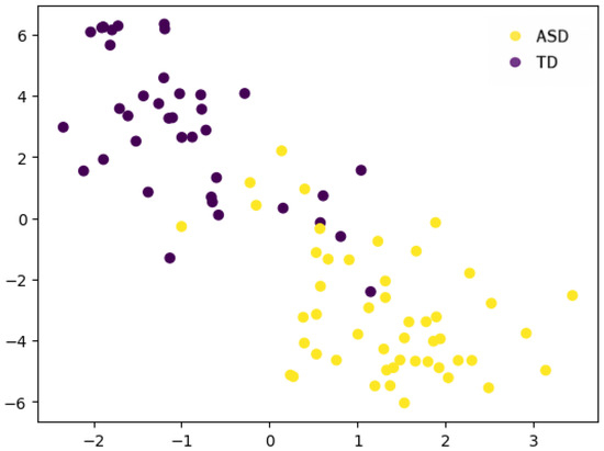 The models were trained using a total of attributes, corresponding to the values of the three metrics across the 19 EEG channels. Before training the models, we used all the features computed from a single channel and visualized the subjects in 2D using the t-SNE technique. t-SNE is a nonlinear dimensionality reduction technique that converts pairwise distances in high-dimensional space into conditional probabilities representing similarities. It then embeds the data in a low-dimensional space by minimizing the Kullback–Leibler divergence between the high-dimensional similarity distribution and a Student-t distribution over pairwise distances in the embedding via gradient descent. This approach excels at preserving local neighborhood structure and revealing cluster patterns, though absolute global distances may not be accurately represented. The results of the t-SNE technique are presented in Figure 2 for each channel separately. Additionally, by concatenating the features from the individual channels and reapplying t-SNE, the result shown in Figure 3 was obtained, indicating an almost perfect clustering.