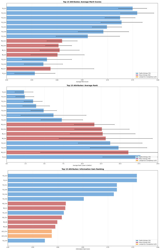 Attribute evaluation based on information gain metric. Only the top 15 attributes are shown. The top five best attributes correspond to the value of Tsallis Entropy in channels 5, 13, 11, 16, and 15 corresponding to electrodes Fz, T5, C4, P4, and Pz accordingly, suggesting importance in signatures in the frontal, temporal, central, and parietal regions.
