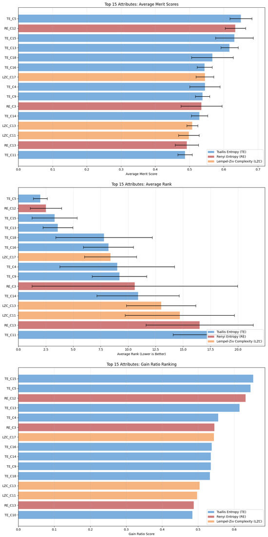 Attribute evaluation based on gain ratio metric. Only the top 15 attributes are shown. The top five best attributes correspond to the value of Tsallis Entropy in channels 5, 15, 13, and 18 corresponding to electrodes Fz, Pz, T5, and O1 accordingly and the value of Renyi Entropy in channel 12, coresponding to electrode T4, suggesting importance in signatures in the frontal, temporal, parietal, and ocipital regions.