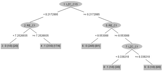 Decision tree obtained using the RepTree algorithm with all of the 57 attributes. The root of the tree is the value of the Lempel–Ziv Complexity (LZC) in the Pz channel. The tree consists of a total of nine nodes (five leaves and four branching nodes). At the first level of the tree are nodes comparing the values of Rényi Entropy (RE) in the Fp1 channel. At the second level, there is another node that branches the tree depending on the LZC value in the Fp1 channel. The number before the small brackets indicates the class (0—Control, 1—ASD). The small brackets at the leaves show the ratio of the total number of children in that leaf to the misclassified children during the model training phase. The medium brackets show the ratio of the total number of children in that leaf to the misclassified children during the tree pruning phase.