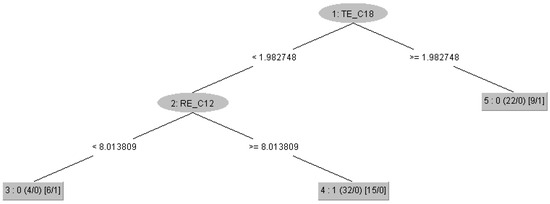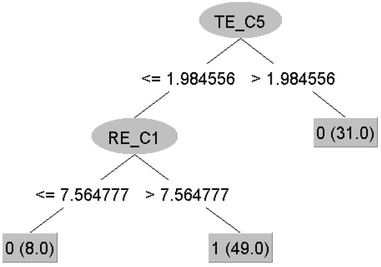 Decision tree obtained using the RepTree algorithm with only the top five attributes based on the gain ratio. The root of the tree is the value of Tsallis Entropy (TE) in the O1 channel. The tree consists of a total of five nodes (three leaves and two branching nodes). At the first level of the tree is a node comparing the value of the Rényi Entropy (RE) in the T4 channel. The number before the small brackets indicates the class (0—Control, 1—ASD). The small brackets at the leaves show the ratio of the total number of children in that leaf to the misclassified children during the model training phase. The medium brackets show the ratio of the total number of children in that leaf to the misclassified children during the tree pruning phase.