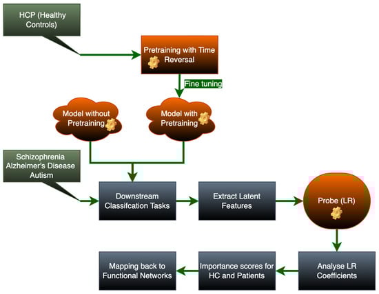 Our proposed methodology consists of four phases. First, the model undergoes pretraining with time-reversed inputs to learn robust temporal representations. Next, we perform downstream classification training using transfer learning to adapt the pretrained model to specific tasks. We then learn a mapping from the model’s raw inputs to its latent feature representations. Finally, we probe the latent features by fitting a logistic regression classifier and analyzing the coefficients to determine feature importance for each class. The most influential features are mapped back to functional networks in the input space to interpret their biological or functional relevance.