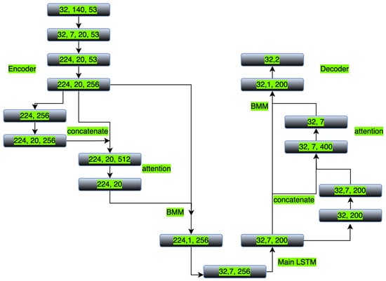Model architecture with dimensional flow for FBIRN: The input (32 × 140 × 53: batch × time × components) is partitioned into 7 segments (32 × 7 × 20 × 53). Each segment’s data (20 × 53) is encoded by the LSTM to 20 × 256 embeddings, resulting in 32 × 7 × 20 × 256 (reshaped to 224 × 20 × 256 for batched processing). Window-level attention computes weights (224 × 20). These are applied to the embeddings via BMM, an operation that performs a weighted sum across the time dimension, to produce a single attended feature vector per window (224 × 1 × 256), which is reshaped to 32 × 7 × 256. The main LSTM processes this sequence to 32 × 7 × 200. Global attention (weights: 32 × 7) then uses BMM to yield the final latent representation (32 × 1 × 200), which is decoded to predictions (32 × 2). This visualization clarifies how hierarchical attention condenses information at multiple temporal scales while preserving the dimensional integrity critical for interpretability.