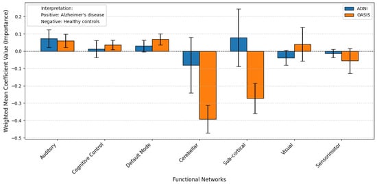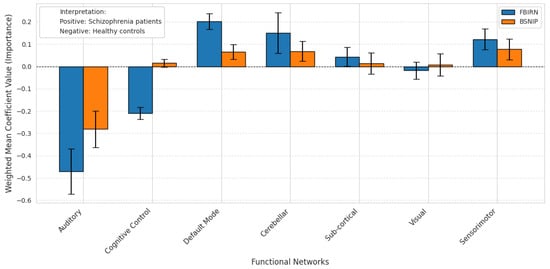 The interpretation of weighted mean coefficient values obtained from our probing framework provides important insights into the model’s reliance on specific brain networks for the three psychiatric conditions under study.