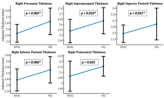 Gray matter thickness differences. Non-video game players (NVG) and video game players (VG) differed significantly (corrected p < 0.05) in gray matter thickness in parietal and occipital areas: Right precuneus, right supramarginal, right superior parietal, right inferior parietal, and right postcentral. (*) denotes the significant p values for the regions, respectively.