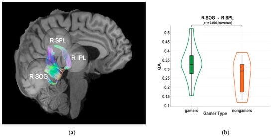 (a) Tractography visualization in a representative subject showing white matter connections between the right superior occipital gyrus (R SOG), right superior parietal lobule (R SPL), and right inferior parietal lobule (R IPL). The x-axis is coded for red from right to left, the y-axis is coded for green from anterior to posterior, and the z-axis is coded for blue from superior to inferior. (b) Violin plot of group differences in quantitative anisotropy (QA) between video game players (VGPs; “gamers”) shown in green and non-video game players (NVGPs; “nongamers”) shown in orange for the R SOG–R SPL connection. Frames and grid lines denote the standard axes of the plot: the y-axis shows QA values, while the x-axis separates the two groups. Significantly higher QA values were observed in VGPs compared to NVGPs (p* = 0.036, Holm-Bonferroni corrected).