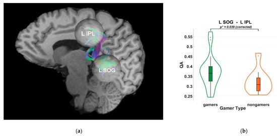 (a) Tractography visualization in a representative subject showing white matter connections between the right superior occipital gyrus (R SOG), right superior parietal lobule (R SPL), and right inferior parietal lobule (R IPL). The x-axis is coded for red from right to left, the y-axis is coded for green from anterior to posterior, and the z-axis is coded for blue from superior to inferior. (b) Violin plot of group differences in quantitative anisotropy (QA) between video game players (VGPs; “gamers”) shown in green and non-video game players (NVGPs; “nongamers”) shown in orange for the L SOG–L IPL connection. Frames and grid lines denote the standard axes of the plot: the y-axis shows QA values, while the x-axis separates the two groups. Significantly higher QA values were observed in VGPs compared to NVGPs (p* = 0.036, Holm-Bonferroni corrected).
