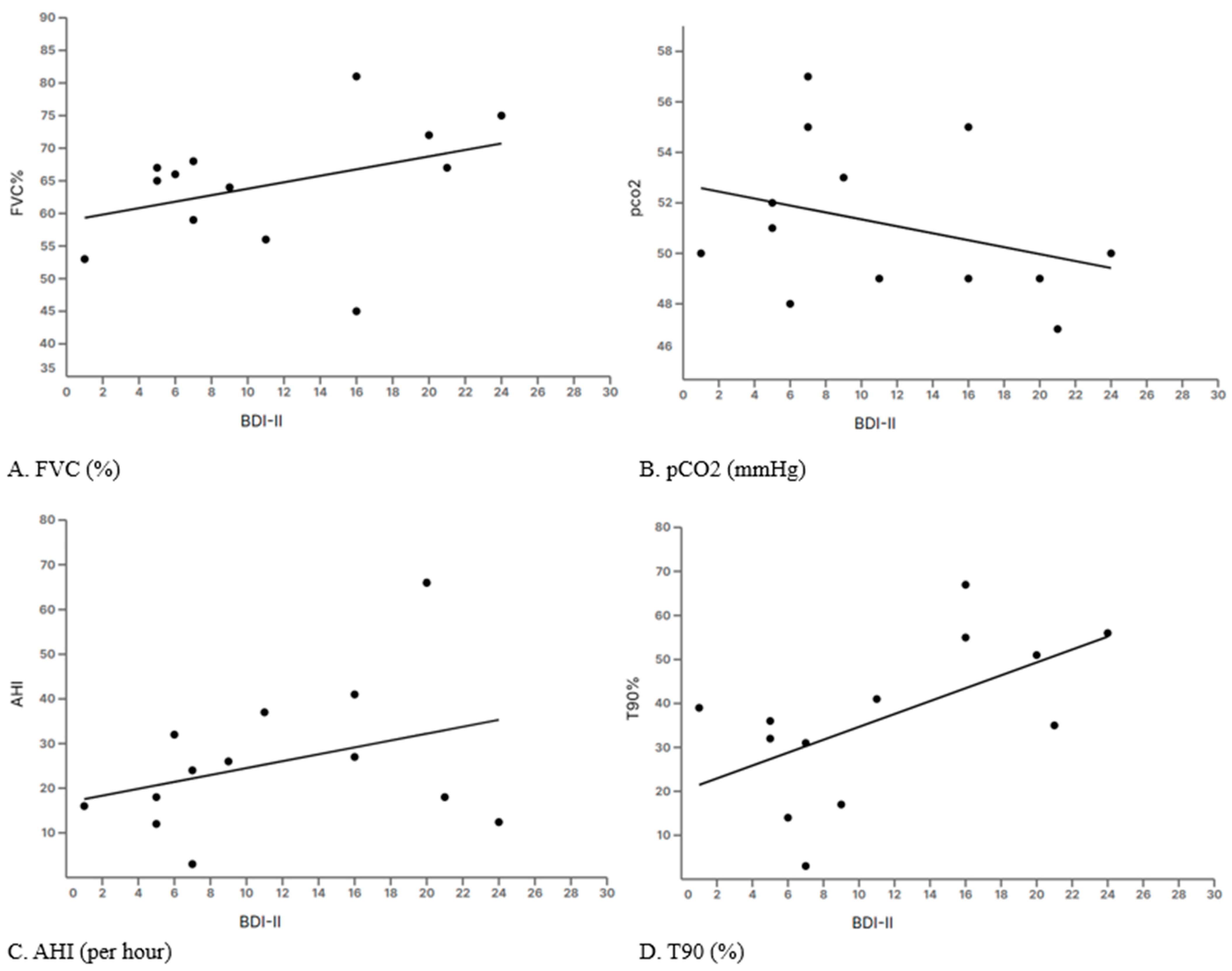 Figure 2A–C). Notably, BDI-II scores were significantly correlated with baseline nocturnal hypoxemia, with higher T90% values predicting higher depression scores (R
