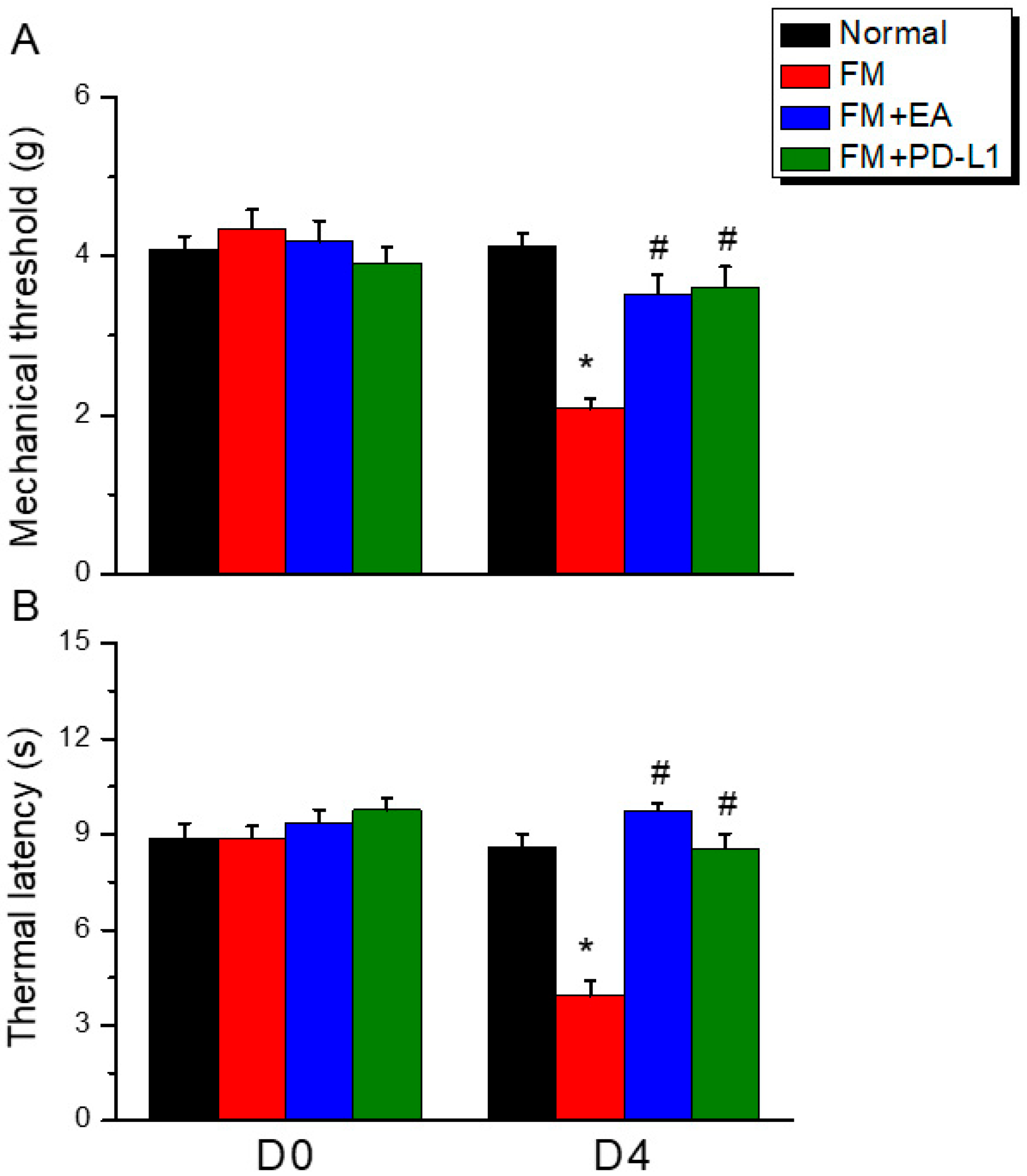 Figure 1. Electroacupuncture and PD-L1 i.c.v. inoculation reduced fibromyalgia pain after ICS. (A) Mechanical hyperalgesia verified using the von Frey test. (B) Thermal hyperalgesia determined using Hargraves’ test. Normal: normal mice; FM: fibromyalgia mice; FM + EA: fibromyalgia mice treated with EA; FM + PD-L1: fibromyalgia mice treated with PD-L1. * p < 0.05 vs. Normal. # p < 0.05 vs. FM group. n = 9.