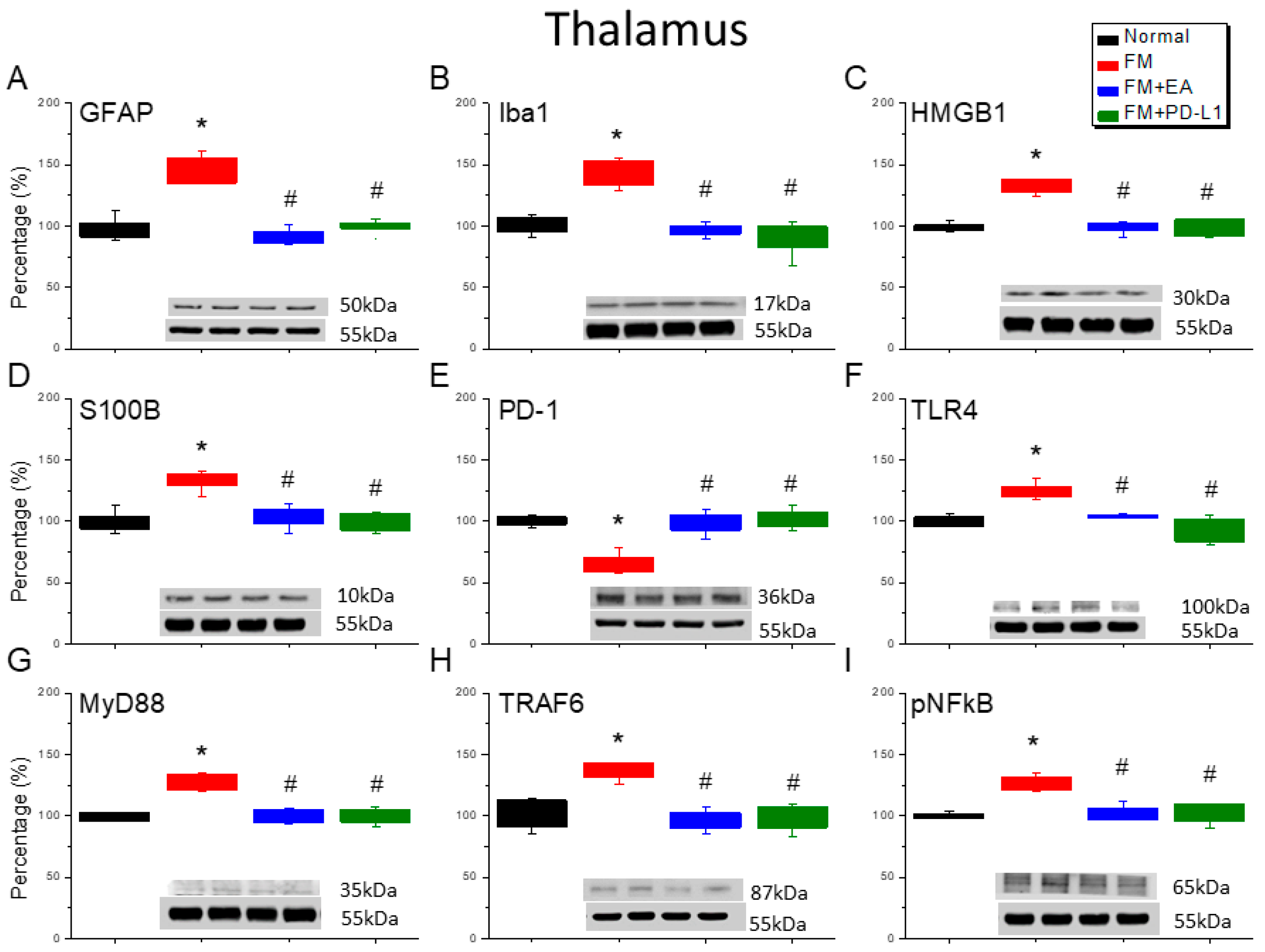 Figure 4. The expression levels of PD-1 were lower, and pain-related molecule levels increased at day 4 after fibromyalgia induction in the thalamus in all groups. Western blot with four lanes of each protein: Normal, FM, FM + EA, and FM + PD-L1. (A) GFAP, (B) Iba1, (C) HMGB1, (D) S100B, (E) PD-1, (F) TLR4, (G) MyD88, (H) TRAF6, and (I) pNF-κB protein levels in Normal, FM, FM + EA, and FM + PD-L1. * p < 0.05 vs. Normal. # p < 0.05 vs. FM group. n = 6 mice per group. The percentage was calculated by dividing the value from the treatment group by that from the normal group.