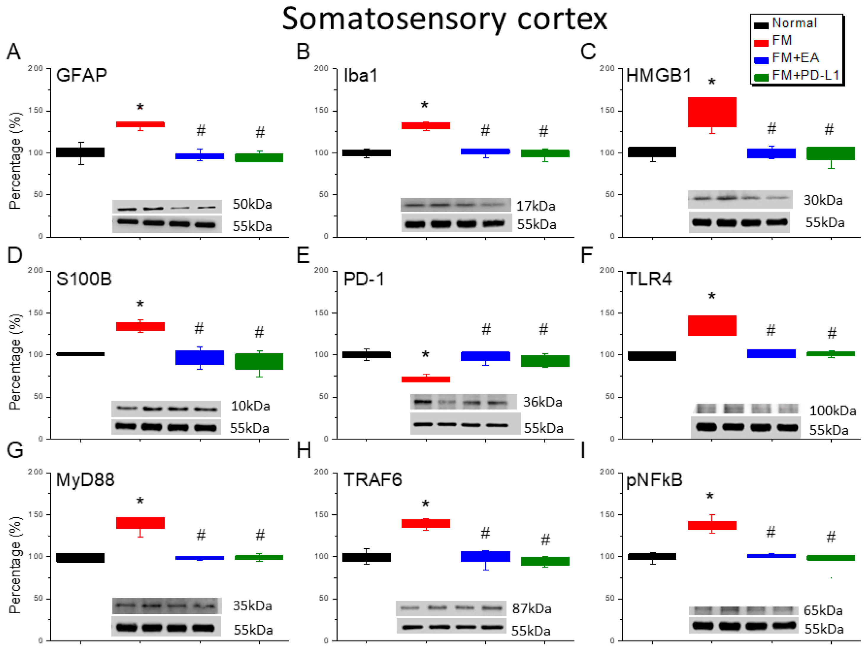Figure 5. The expression levels of PD-1 were lower, and pain-related molecule levels increased at day 4 after fibromyalgia induction in the SSC in all groups. Western blot with four lanes of each protein: Normal, FM, FM + EA, and FM + PD-L1. (A) GFAP, (B) Iba1, (C) HMGB1, (D) S100B, (E) PD-1, (F) TLR4, (G) MyD88, (H) TRAF6, and (I) pNF-κB protein levels in Normal, FM, FM + EA, and FM + PD-L1. * p < 0.05 vs. Normal. # p < 0.05 vs. FM group. n = 6 mice per group. The percentage was calculated by dividing the value from the treatment group by that from the normal group.