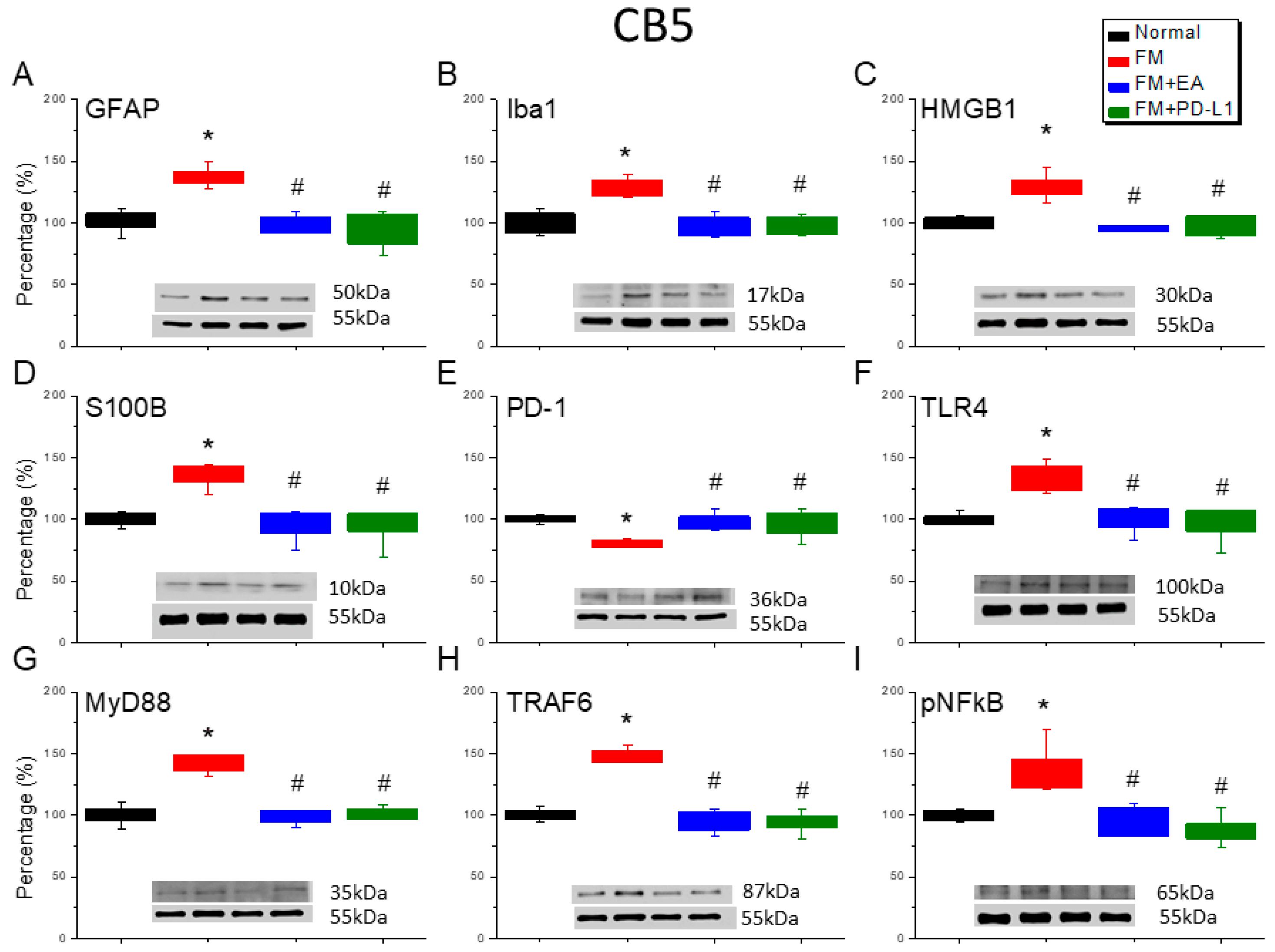 Figure 6. The expression levels of PD-1 were lower, and pain-related molecule levels increased at day 4 after fibromyalgia induction in the CB5 in all groups. Western blot with four lanes of each protein: Normal, FM, FM + EA, and FM + PD-L1. (A) GFAP, (B) Iba1, (C) HMGB1, (D) S100B, (E) PD-1, (F) TLR4, (G) MyD88, (H) TRAF6, and (I) pNF-κB protein levels in Normal, FM, FM + EA, and FM + PD-L1. * p < 0.05 vs. Normal. # p < 0.05 vs. FM group. n = 6 mice per group. The percentage was calculated by dividing the value from the treatment group by that from the normal group.