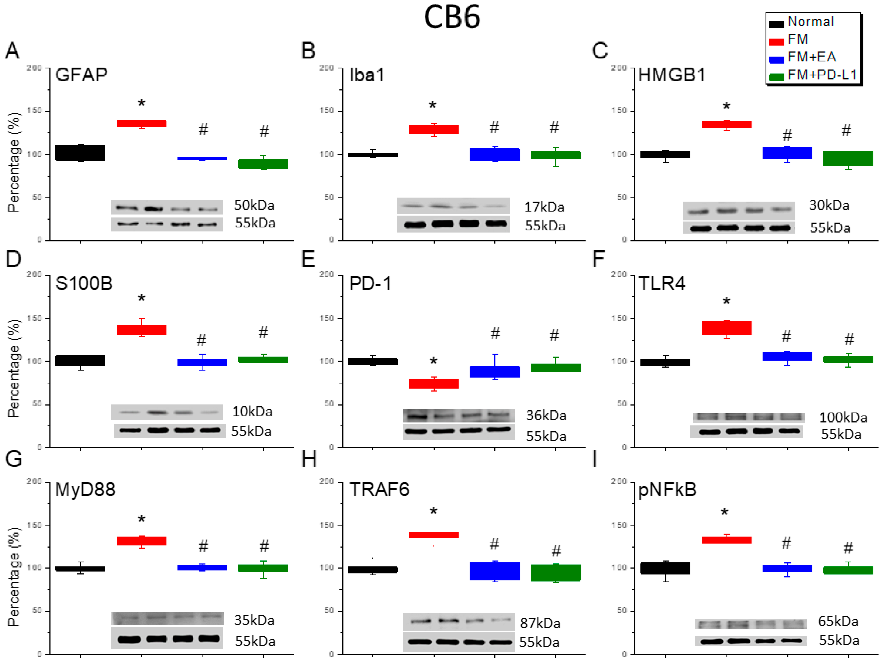Figure 7. The expression levels of PD-1 were lower, and pain-related molecule levels increased at day 4 after fibromyalgia induction in the CB6 in all groups. Western blot with four lanes of each protein: Normal, FM, FM + EA, and FM + PD-L1. (A) GFAP, (B) Iba1, (C) HMGB1, (D) S100B, (E) PD-1, (F) TLR4, (G) MyD88, (H) TRAF6, and (I) pNF-κB protein levels in Normal, FM, FM + EA, and FM + PD-L1. * p < 0.05 vs. Normal. # p < 0.05 vs. FM group. n = 6 mice per group. The percentage was calculated by dividing the value from the treatment group by that from the normal group.