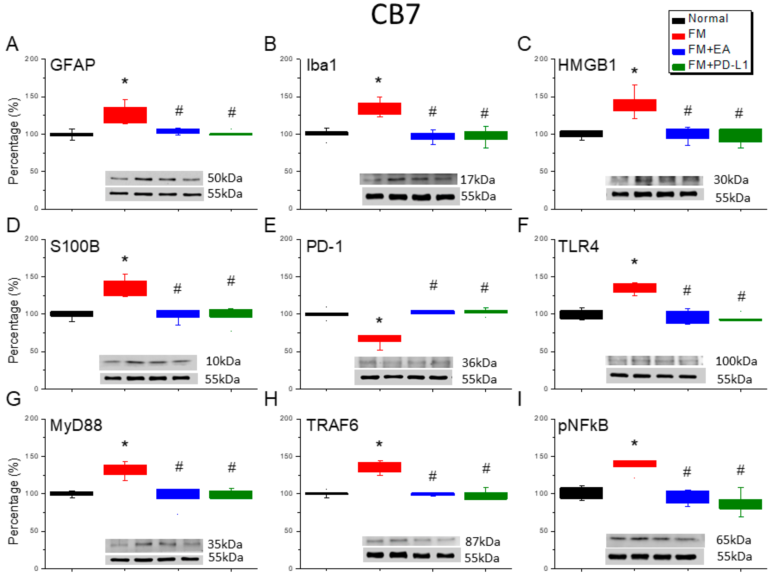 Figure 8. The expression levels of PD-1 were lower, and pain-related molecule levels increased at day 4 after fibromyalgia induction in the CB7 in all groups. Western blot with four lanes of each protein: Normal, FM, FM + EA, and FM + PD-L1. (A) GFAP, (B) Iba1, (C) HMGB1, (D) S100B, (E) PD-1, (F) TLR4, (G) MyD88, (H) TRAF6, and (I) pNF-κB protein levels in Normal, FM, FM + EA, and FM + PD-L1. * p < 0.05 vs. Normal. # p < 0.05 vs. FM group. n = 6 mice per group. The percentage was calculated by dividing the value from the treatment group by that from the normal group.