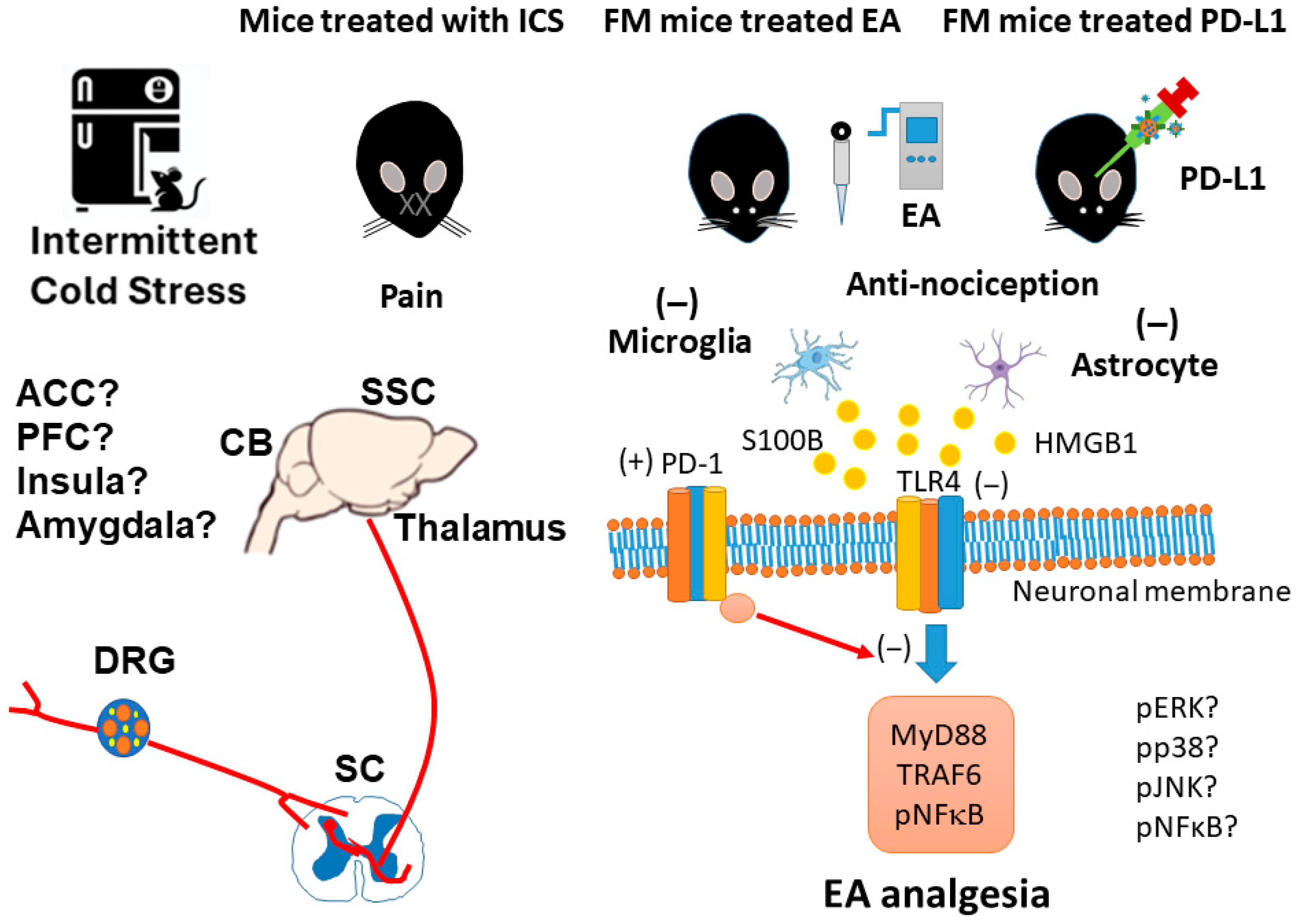 We found that mechanical and thermal pain in mice with ICS-induced fibromyalgia was reversed by 2 Hz EA and PD-L1 injection. Further, levels of microglia/astrocytes and also HMGB1 and S100B were increased, whereas PD-1 was decreased, in the DRG, SC, thalamus, SSC, and CB5-7 of fibromyalgia mice. Also, the expression of nociceptive TLR4 and its related downstream elements increased after fibromyalgia induction, which was then repressed by EA or PD-L1 injection in all of the tested regions except for the DRG, where PD-L1 injection could not reverse changes in expression, suggesting it is ineffective here. Our results indicate that EA’s effect on the PD-L1/PD1 pathway might be the key to its potential as a therapeutic target for fibromyalgia (Figure 9). Our key discoveries are that FM pain was associated with the PD-L1 signaling pathway, EA significantly reduced FM pain through increasing PD-1 receptors, and i.c.v. injection of PD-L1 suggests the PD-1 receptor has precise mechanisms that lead to analgesic effects. A limitation of the present study was that we only injected the FM mice with PD-L1. In the future, PD-1 knockout models should also be injected with PD-L1. The current study also had a small sample size; in future studies, a larger group is needed for the detection of larger effect sizes, with a power of at least 60%. Also, other animal models that exhibit greater similarity with clinical FM need to be studied in the future. We have to perform immunofluorescence staining at specific regions of DRG, SC, thalamus, SSC, and CB5-7 of fibromyalgia mice to determine which regions are involved in pain transmission. We will also conduct experiments to examine the PD-L1/PD1 pathway in pain-associated regions such as the anterior cingulate cortex, prefrontal cortex, insula, and amygdala in the future. We suggest that future research should implement these recommendations so that EA can be established as an FM treatment.