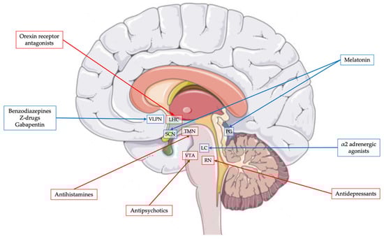 Neuroanatomical structures implicated in the regulation of sleep (blue) and wakefulness (red), serving as principal targets for pharmacological interventions that facilitate sleep through modulation of sleep-promoting and arousal-related areas. Legend: LC: locus coeruleus; LHC: lateral hypothalamus cortex; PG: pineal gland; RN: raphe nucleus; SCN: suprachiasmatic nucleus; TMN: tuberomammillary nucleus; VLPN: ventrolateral preoptic nucleus; VTA: ventral tegmental area.