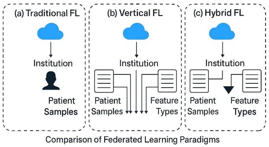28]. Initial applications of FL in healthcare predominantly focused on horizontally partitioned datasets, where different institutions contribute patient data samples that share the same feature space but represent disjoint patient cohorts. Landmark studies in brain tumor segmentation and in COVID-19 diagnosis have demonstrated that horizontally federated models can achieve performance comparable to traditionally centralized training while adhering to data privacy requirements [
