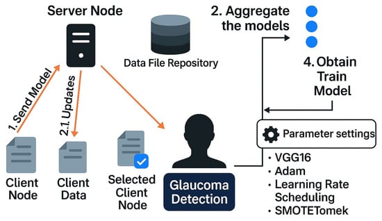 and employs a cosine annealing scheduler. To address class imbalance in glaucoma labels, the SMOTETomek technique is used to oversample minority classes and eliminate borderline noise. Training is conducted over 50 global rounds with 5 local epochs per client per round. The central server aggregates encrypted updates using secure aggregation, forming a privacy-preserving global model. As illustrated in