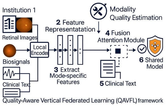Figure 3, the proposed QAVFL framework enables decentralized, privacy-preserving multimodal glaucoma screening. Different institutions contribute specific modalities such as clinical text, retinal images, and biosensor signals, which are first processed through local encoders to extract feature representations. These feature vectors are then securely aggregated without sharing raw data, ensuring compliance with data protection regulations such as HIPAA and GDPR. Unlike conventional vertical FL approaches that rely on naive feature concatenation, the QAVFL framework introduces a Fusion Attention Module that dynamically integrates modality-specific features. This attention mechanism is guided by a Modality Quality Estimation component, which assigns adaptive importance weights based on the reliability and informativeness of each modality. The final fused representation is used to update the global shared model, improving diagnostic accuracy while maintaining robustness against missing or low-quality modalities.