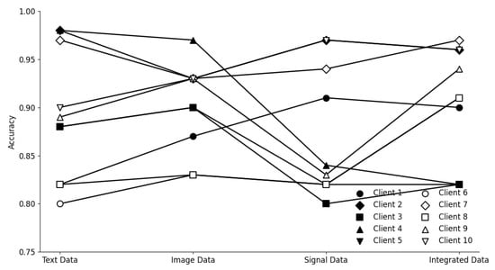 Figure 4 underscores the importance of multimodal integration in enhancing classification performance. Notably, Clients 5 and 6 exhibited significant accuracy gains when transitioning from unimodal to integrated data streams. This improvement reflects the effectiveness of crossmodal representation learning and suggests that the fusion mechanism successfully captures intermodality correlations that were previously inaccessible to local models. Conversely, Clients 1 and 8 demonstrated relatively flat accuracy curves, indicating minimal benefit from modality fusion. This could be attributed to either (a) limited data variance within their original modality or (b) a lack of strong alignment between their local features and the global representation space. Such stagnation suggests a saturation of representational learning under constrained modality views, and it justifies the need for data augmentation or domain adaptation in future extensions.
