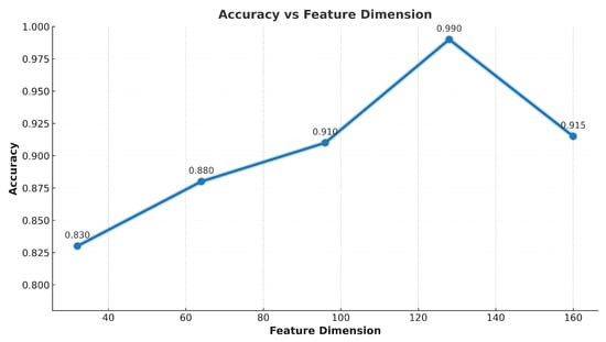 Figure 5, feature dimensionality plays a critical role in influencing model generalization and discriminative power. Across experiments, the best classification performance (98%) was observed at 128 feature dimensions. This configuration strikes a balance between compactness and expressiveness, enabling the model to abstract relevant information without introducing redundancy. Interestingly, dimensions lower than 64 resulted in significant performance degradation, likely due to insufficient representational capacity. At the other end, increasing dimensions beyond 128 yielded only marginal improvements or even slight reductions in accuracy. This phenomenon can be attributed to the curse of dimensionality, where excessive features introduce noise, sparsity, and overfitting.