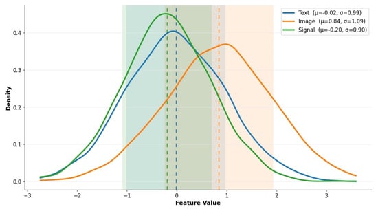 Figure 6 presents the kernel density estimation (KDE) plots of the first normalized feature across all three modalities, like text, image, and signal. This visualization reveals clear distinctions in the statistical distribution of features extracted from each modality, reinforcing the non-triviality of the fusion problem. Specifically, image-derived features exhibit a pronounced right-skewed distribution centered around