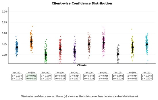 The distribution of confidence scores across clients is visualized in