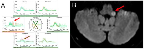 Illustrative case of a patient presenting with acute-onset persistent vertigo and inability to walk. This 51-year-old female patient with a 48 h history of acute-onset and persistent vertigo, inability to walk and vomiting presented to the ED. On examination, horizontal gaze-evoked nystagmus was observed. The head-impulse test was abnormal to the left (demonstrating a catch-up saccade as confirmed on video-head-impulse testing for the left lateral and left posterior canal [Panel (A), marked with red arrows]). The patient did not exhibit a skew deviation or spontaneous nystagmus. She was unable to stand or sit unassisted (consistent with grade 3 truncal instability [89]). Diffusion-weighted imaging on MRI revealed a discrete swelling lesion in the left dorsolateral medulla (Panel (B), marked with a red arrow). The patient had supratentorial lesions and showed positive oligoclonal bands on lumbar puncture, finally diagnosed with relapsing-remittent MS. The patient was then started on ocrelizumab. For video-head-impulse testing (in panel (A)) eye velocity traces (in green) and head velocity traces (in red for testing the right vestibular organ and in blue for testing the left vestibular organ) are plotted against time. Eye velocity traces were inverted for better visualization and comparison with the head velocity traces. Gain was calculated as the ratio of the area under the de-saccaded eye-velocity curve to the area under the head-velocity curve, corresponding to a de-saccaded position gain. A summary plot in the center shows average individual vestibulo-ocular reflex (VOR)-gains ± 1 standard deviation for all six semicircular canals.