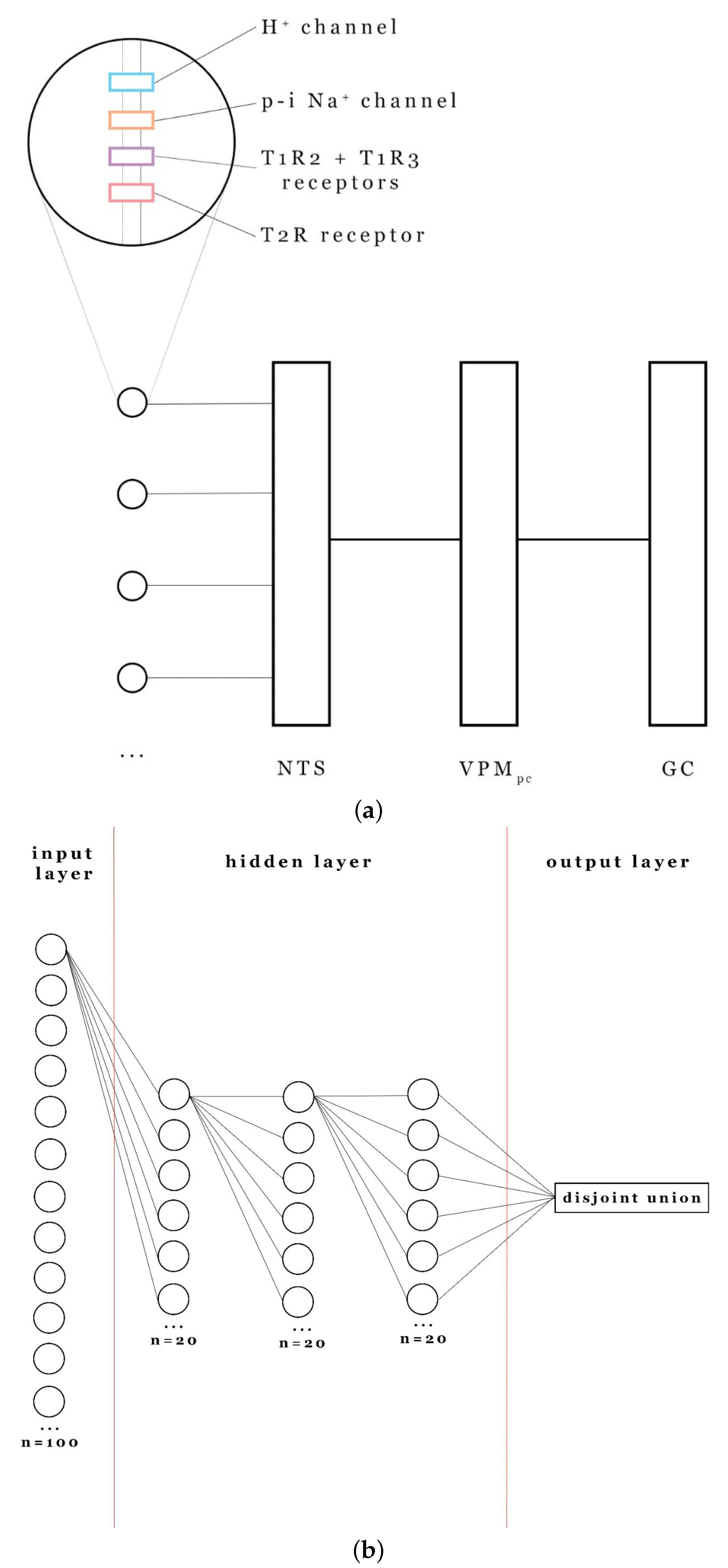 - Network Architecture: The feedforward architecture used is a significant simplification compared to the real gustatory system, which features abundant feedback loops both within taste buds and at the level of the brainstem and thalamus. These feedback connections play a crucial role in adaptation, habituation, and the modulation of taste perception by other modalities (e.g., olfaction).