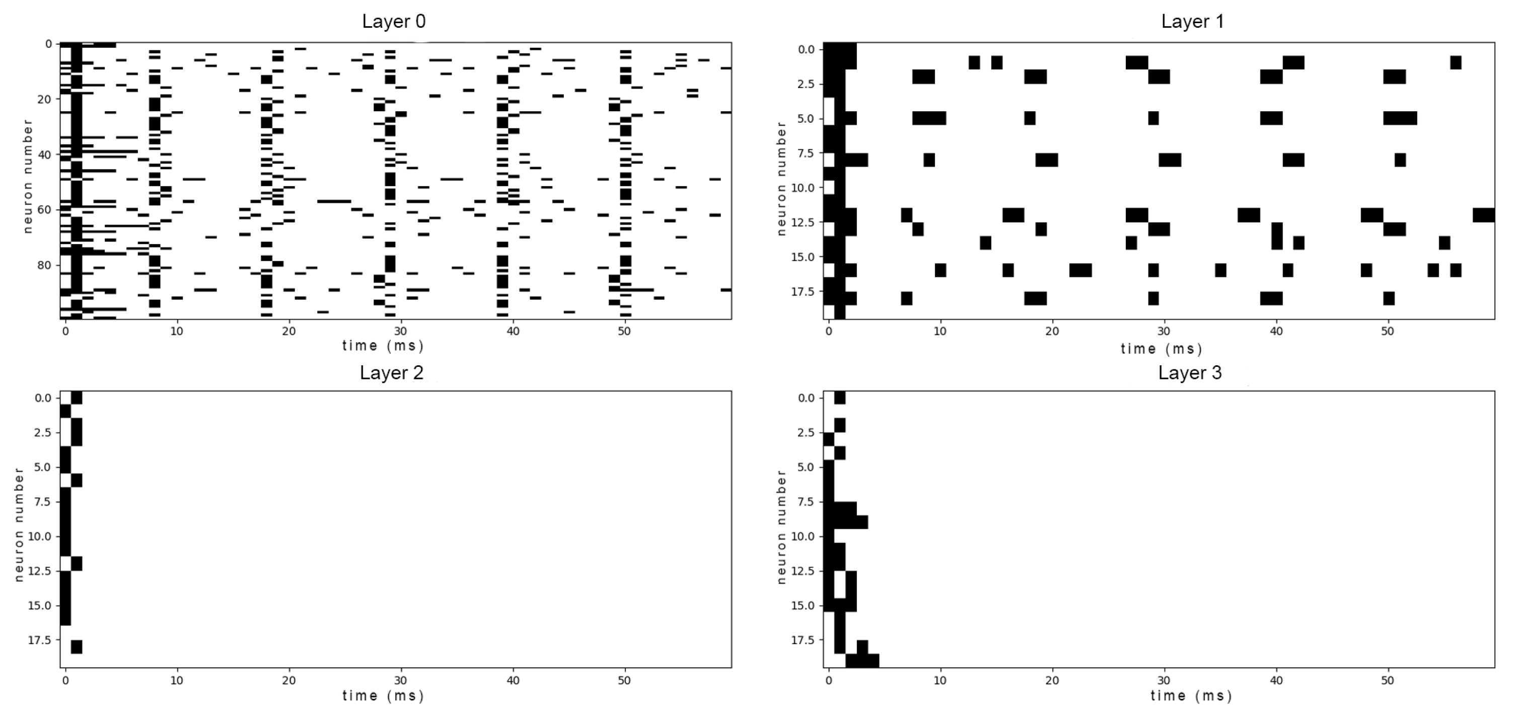The network has 3 hidden layers with 20 neurons in each one. Every neuron is initially connected with all the neurons of the next layer. All the connections are one-sided. The disjoint union of the spike series of all the neurons of the last hidden layer is considered as the network’s output and is used in computing the loss function (see Section 2.5). The network architecture is depicted in Figure A1.