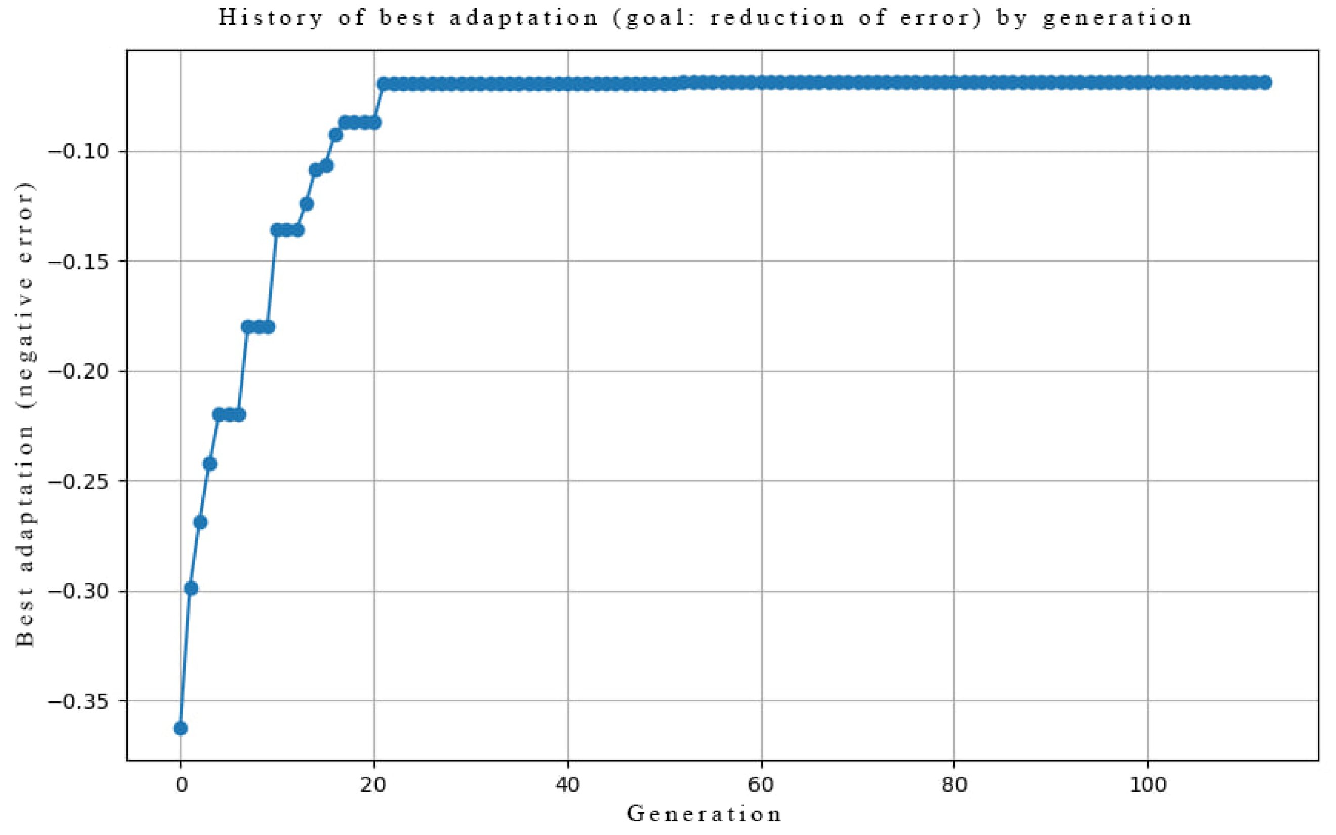 Evolution of fitness (reduction of error) across generations. Normalized to range.