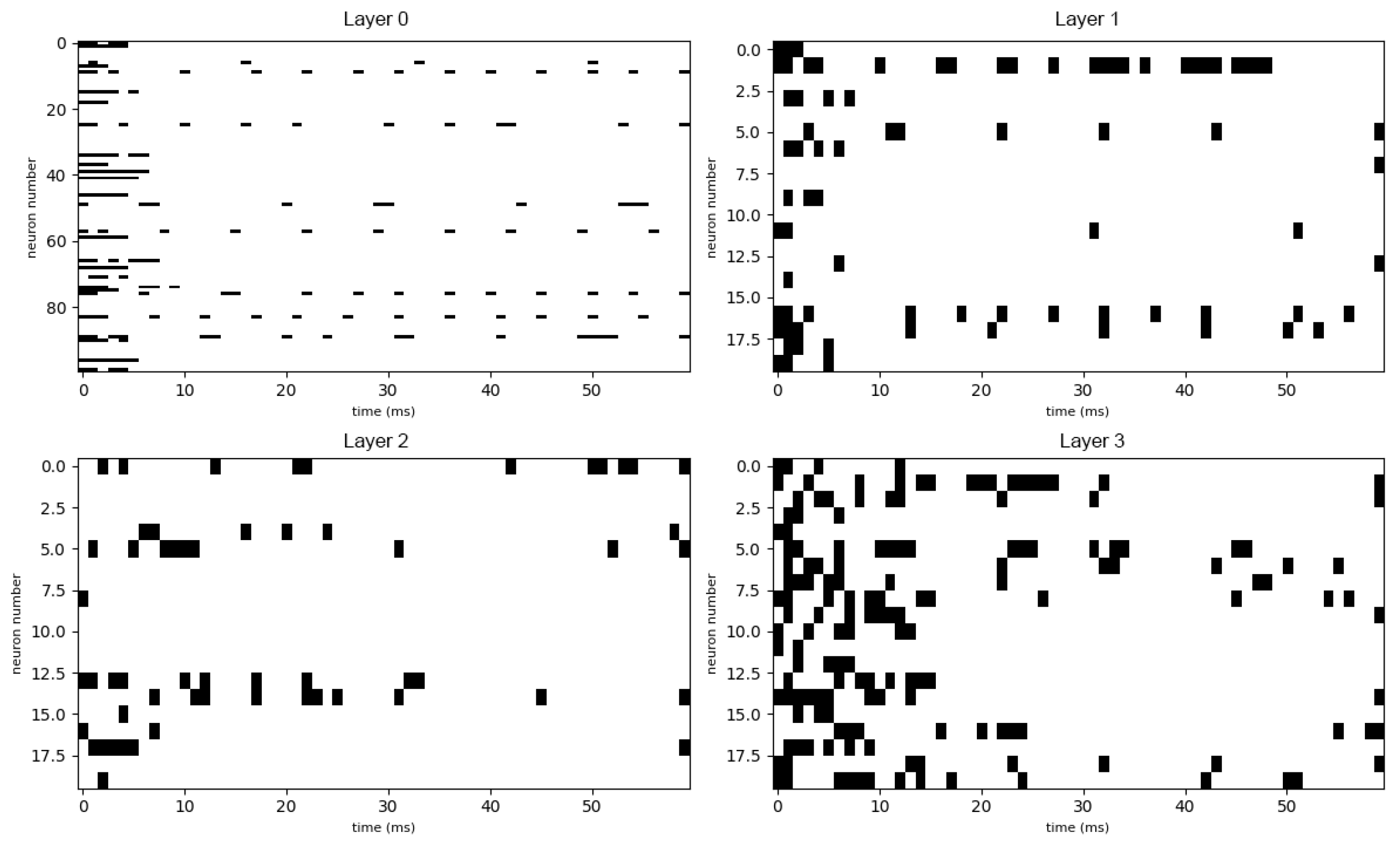 Using the described spike encoding and synaptic transmission mechanisms, we constructed a feedforward spiking neural network with the following layers: