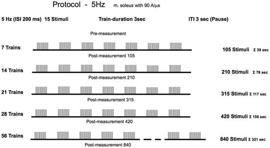 18] was delivered as follows: The experimental group received magnetic stimulation at an intensity of 60% of maximum stimulator output, which corresponded to a current flow of 94 A/µs. This intensity aligns with protocols used in our previous studies and lies within the range commonly reported in the rPMS literature (typically 50–80% of maximum output), and no participants reported pain or discomfort at this intensity level. For clinical application, recording the motor threshold is necessary to individualize the stimulation intensity depending on the neuromotor disorders. The stimulation was delivered at a frequency of 5 Hz, equivalent to five pulses per second with a 200-millisecond interstimulus interval. Each stimulation sequence consisted of 15 stimuli per train, with 3 s rest intervals between consecutive trains. The participants underwent progressive stimulation with incrementally increasing volumes of 105, 210, 315, 420, and 840 total stimuli, which corresponded to 7, 14, 21, 28, and 56 trains, respectively. Importantly, the study employed a cumulative dose design. Each successive condition represented an additional increment in stimulation (e.g., the 210-stimulus condition included the initial 105 stimuli plus 105 additional stimuli). No washout intervals were implemented between stimulation blocks, as the design specifically investigated cumulative effects. This approach was necessary to address the research question regarding minimal effective dose, but introduces the limitation that later measurements reflect both higher total stimulus counts and longer elapsed time since baseline. Due to the progressive cumulative design, later measurement time points occurred at increasingly later times in the experimental session. Specifically, the Post-105 measurement occurred approximately after 5 min into the protocol, while the Post-840 measurement occurred approximately after 70 min. This sequential design was necessary for practical implementation but introduces a temporal confound. All measurements were performed immediately following each stimulation session. No follow-up measurements at later time points were conducted, precluding any assessment of effect persistence or temporal decay characteristics.