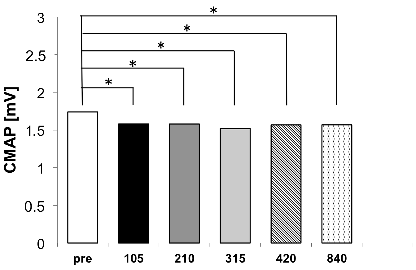 Following the shortest stimulation protocol (105 stimuli), CMAP decreased from 1.74 ± 1.09 mV to 1.58 ± 1.15 mV, corresponding to a mean reduction of 0.16 mV. This change was associated with a large effect size (d