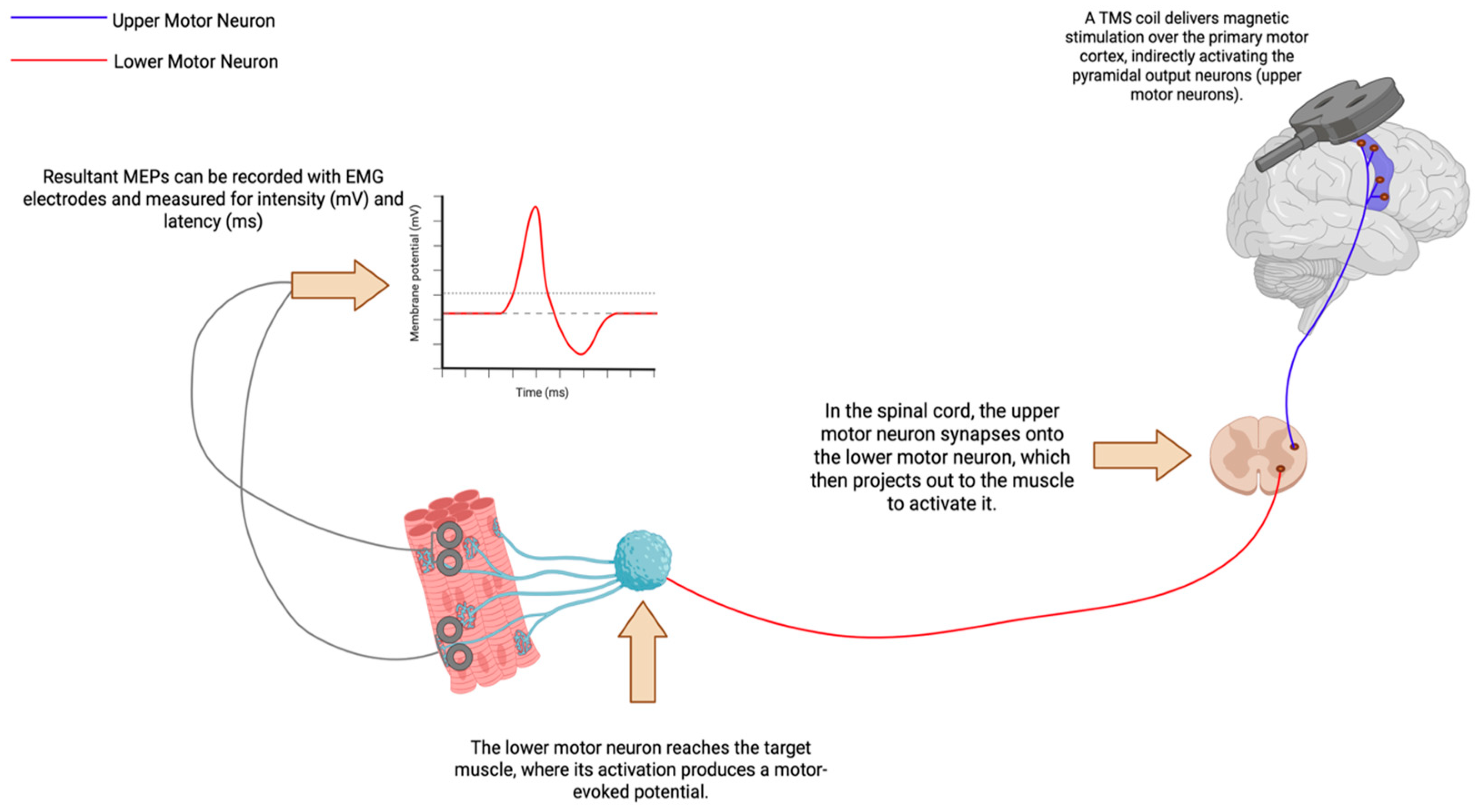 Figure 1. Schematic of TMS: from stimulation to motor effect. This diagram illustrates TMS applied over the M1 using a figure-of-eight coil. The stimulation indirectly activates upper motor neurons in the corticospinal pathway, which in turn activate lower motor neurons in the spinal cord, ultimately causing a contraction in the target muscle. The resulting muscle response is recorded as a motor-evoked potential using EMG electrodes.
