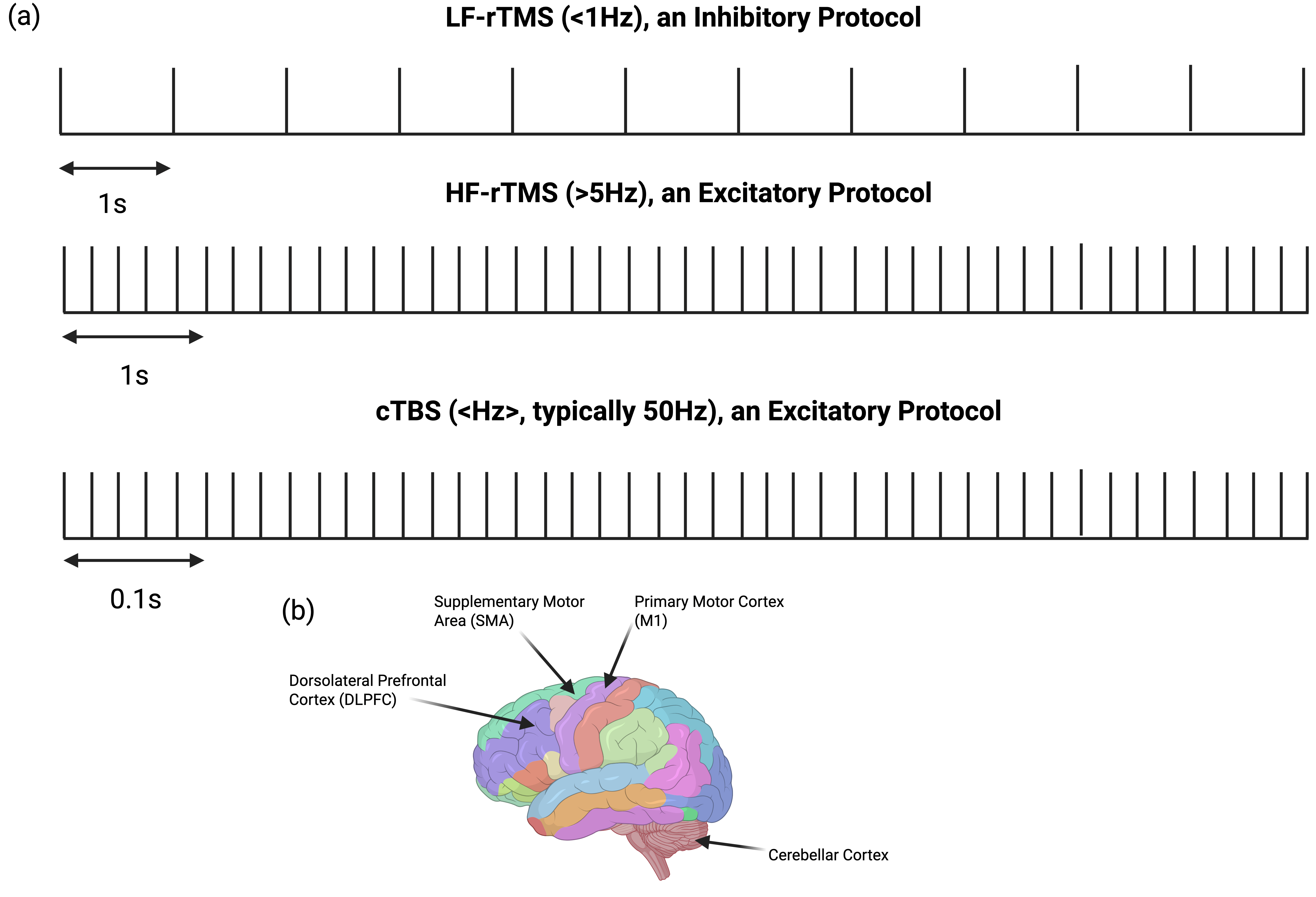 Figure 3. Overview of rTMS stimulation frequencies and commonly targeted cortical regions. (a) Schematic representation of commonly used low- and high-frequency rTMS protocols and their typical excitatory or inhibitory effects, alongside (b) the cortical regions frequently targeted in clinical and research applications. Highlighted regions reflect common stimulation sites across neurological and neuropsychiatric disorders, including the primary motor cortex, supplementary motor area, dorsolateral prefrontal cortex, and cerebellar cortex, all relevant targets within this section.