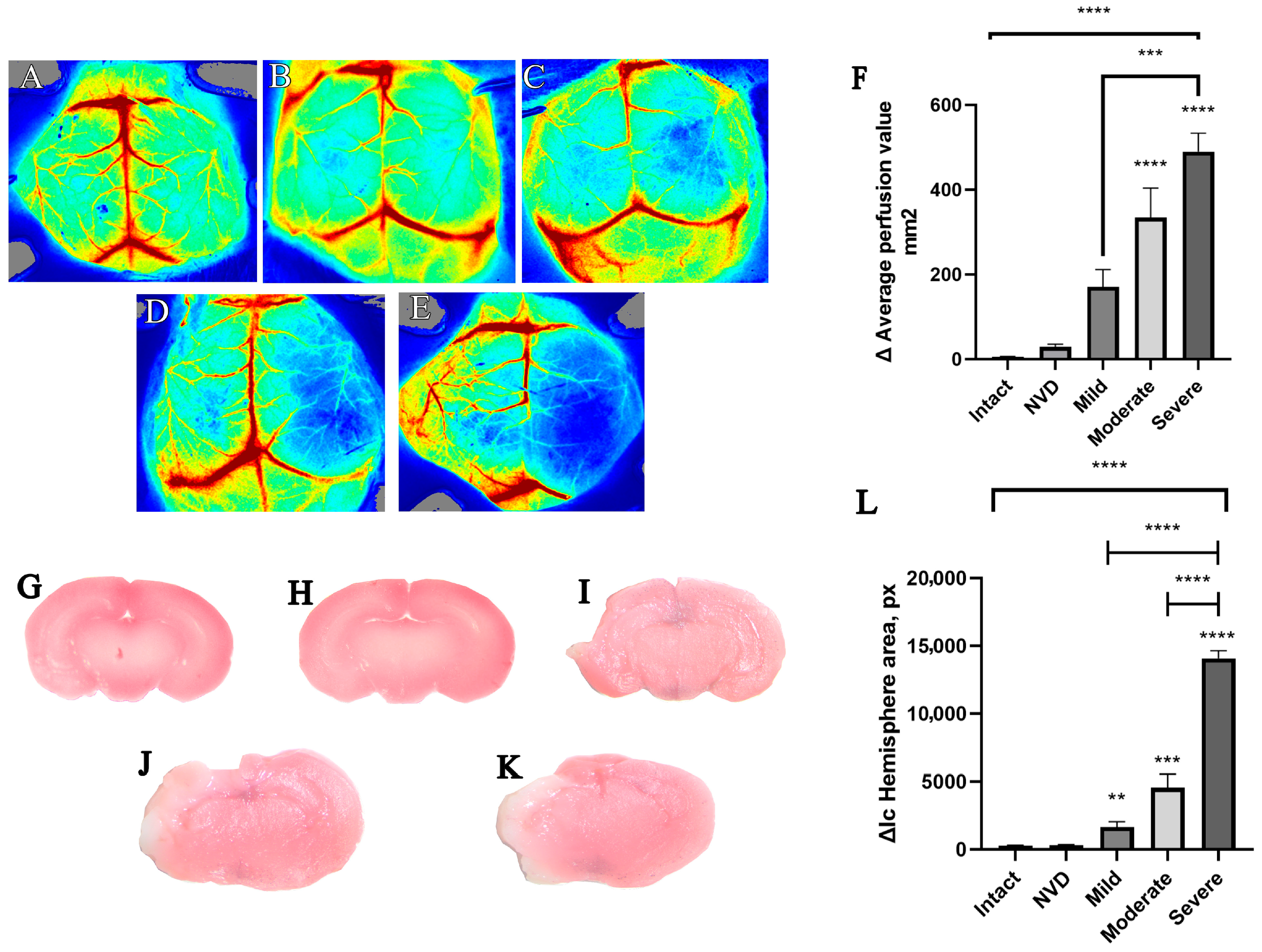 - TTC staining at 24 h: mild group (n = 6), moderate group (n = 6), severe group (n = 4), intact controls (n = 3). NVD (n = 6)