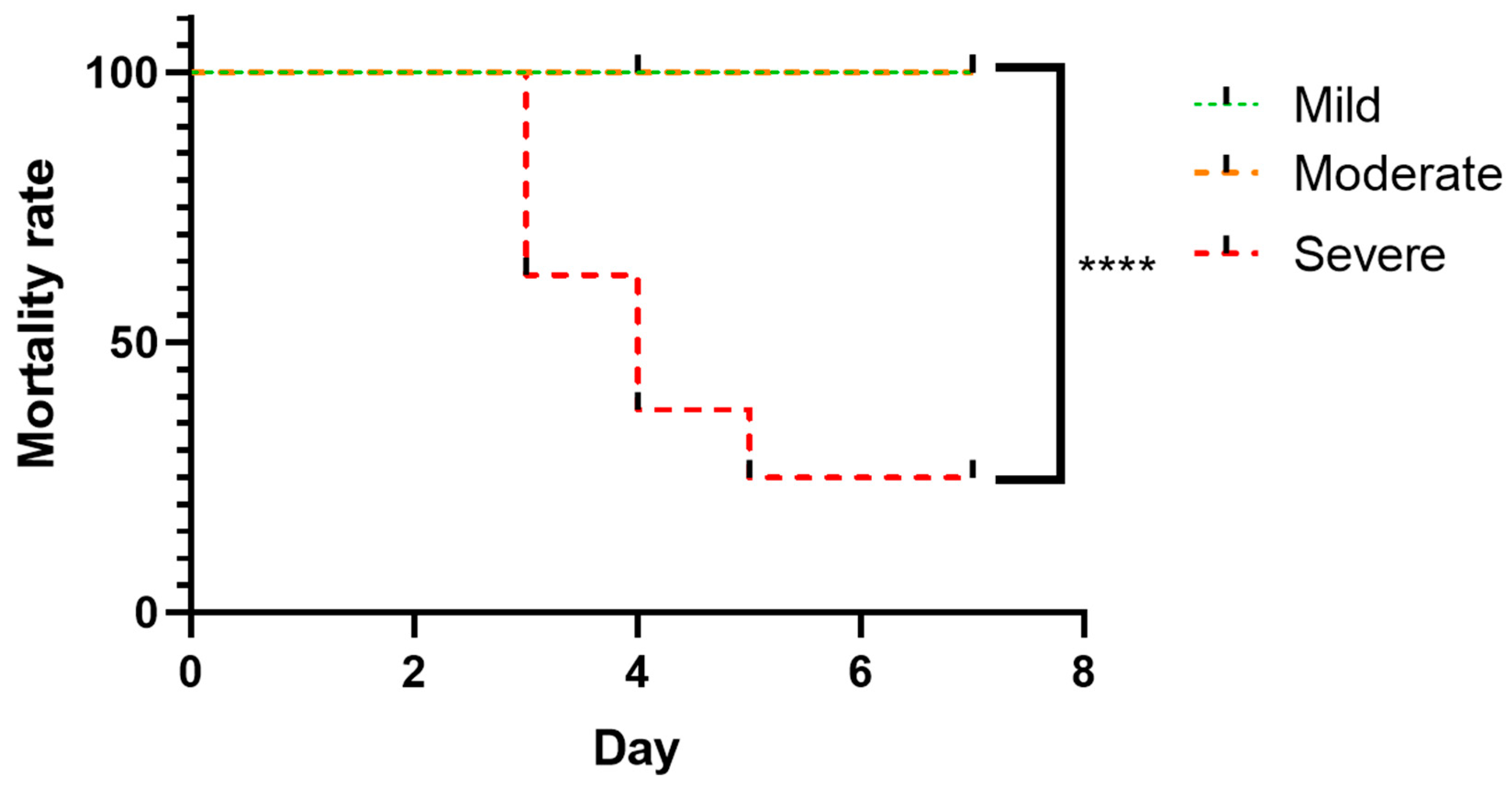 - Survival monitoring over 7 days: mild (n = 10), moderate (n = 9), severe (n = 7), intact (n = 3).