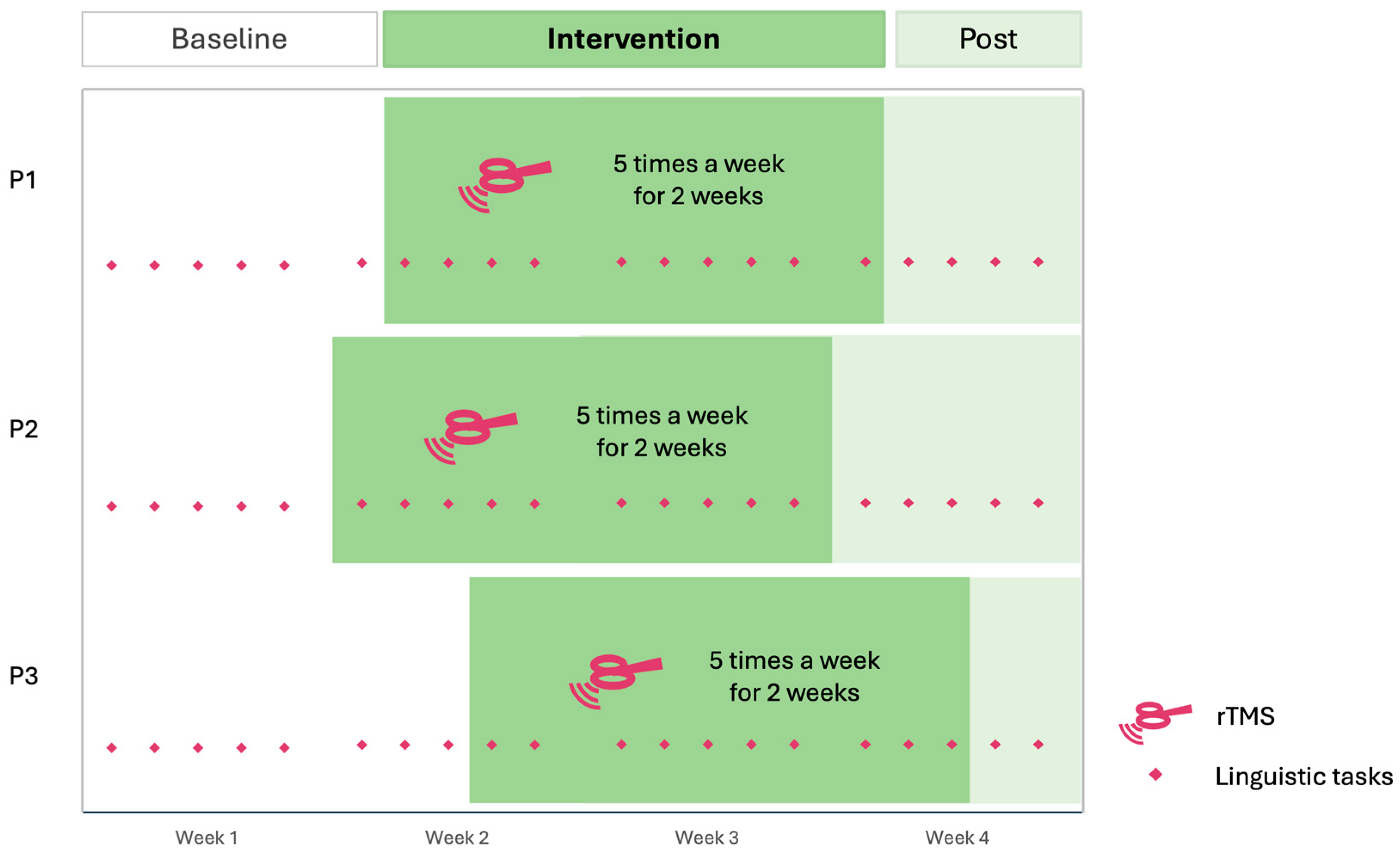 - Arheix-Parras, S.; Franco, J.; Siklafidou, I.; Villain, M.; Rogue, C.; Python, G.; Glize, B. Neuromodulation of the Right Motor Cortex of the Lips with Repetitive Transcranial Magnetic Stimulation to Reduce Phonological Impairment and Improve Naming in Three Persons with Aphasia: A Single-Case Experimental Design. Am. J. Speech-Lang. Pathol. 2024, 33, 2023–2040. [Google Scholar] [CrossRef]
