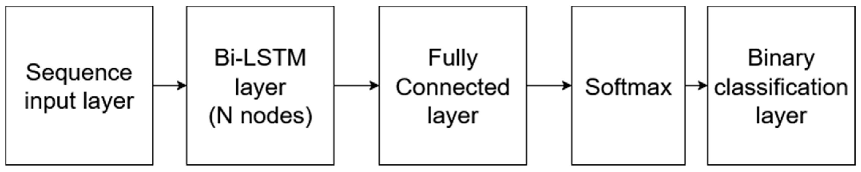 The experimental evaluation was designed to assess the performance of the proposed BiLSTM-based seizure detection framework using the EPILEPSIAE dataset. All experiments were conducted using pre-segmented EEG recordings consisting of balanced seizure and non-seizure intervals, compiled into five-minute data packets. Due to the extreme class imbalance inherent in continuous EEG recordings, seizure detection models trained on fully realistic data distributions often converge toward trivial solutions that favor non-seizure predictions, resulting in excessively high false-negative rates. To mitigate this bias and enable stable training and comparative evaluation of model architectures, seizure and non-seizure segments were artificially balanced in this study.